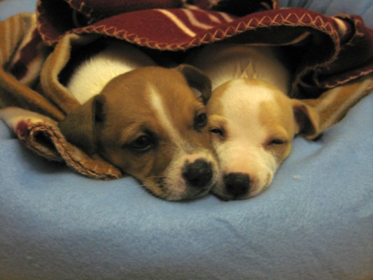 Jack Russell sibling pups snuggling in each other's company with Zorro keeping a watchful eye out whilst his sister Pepper snoozes.